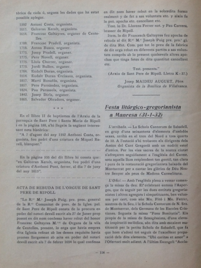 Artículo “ Acta de entrega del órgano de San Pedro de Ripoll”, Órgano Francesc Galtaires, iglesia de San Pedro de Ripoll. Gerona. Revista Parroquial de Música Sagrada, n.º Any VI, n.º 60, 1932