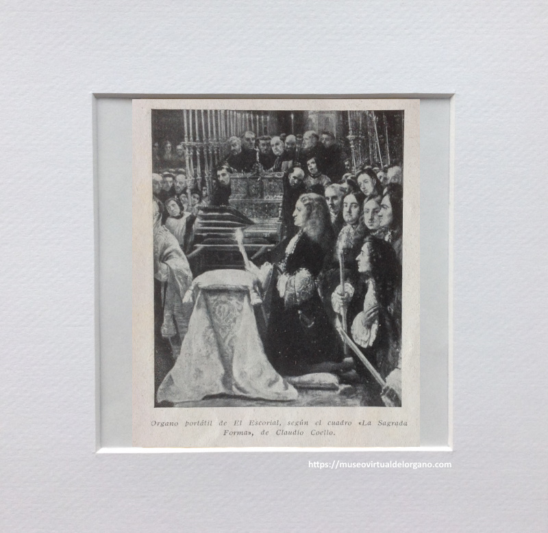 | Miniatura | ![Órgano portátil de El Escorial, según el cuadro “La Sagrada Forma”, de Claudio Coello [Recorte de prensa], en Ezequiel Martín, “El órgano en sus distintas épocas”, La Hormiga de Oro, vol. XLVIII, n. 47, 1931, pp. 752](https://museovirtualdelorgano.com/wp-content/uploads/2024/03/f501_w.jpg) |