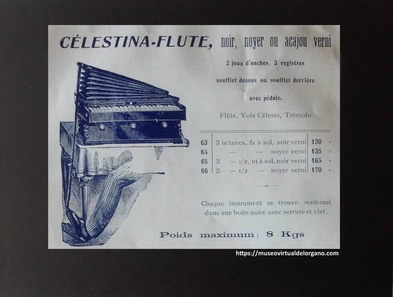 | Órgano | Célestina-Flute nº 63, 2 jeux d´anches, 3 registres. Fabrique d’harmoniums «Les petits-fils de M.Kasriel» à Paris. 6 de la rue Tolain, ca. 1930 |