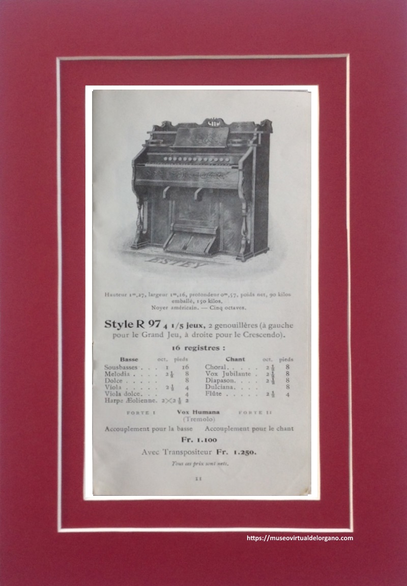 MiniaturaModelo Style R97. Catalogue Orgues et Pianos Estey, Agence Générale Costallat et Cie., París, 1910