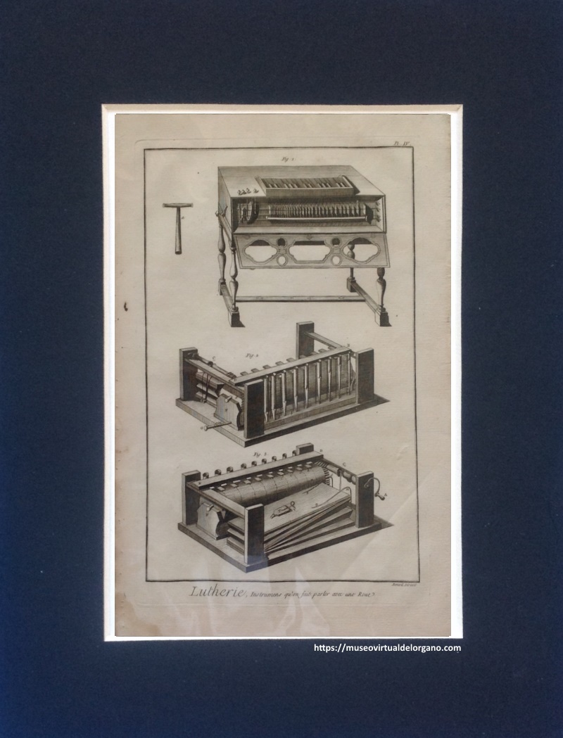 | Notas | Este grabado es parte de la obra, Encyclopédie ou Dictionnaire raisonné des sciences, des arts et des métiers, vol. 5. Lutherie. Seconde suite. (PLANCHE IV) , Diderot, Denis ; d’Alembert, Jean. Paris, 1767