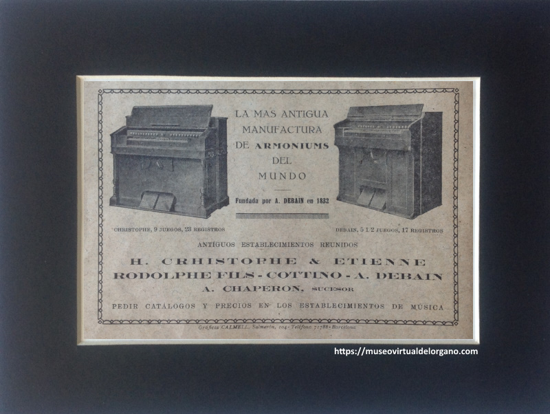 Publicidad de los harmoniums H. Christophe & Etienne (modelo de 9 juegos y 23 registros), Rodolphe Fils, Cottino, A. Debain (modelo 5 1 2 juegos y 17 registros), A. Chaperon, sucesor, distribuidos por la Casa Parramón de Barcelona, 1929