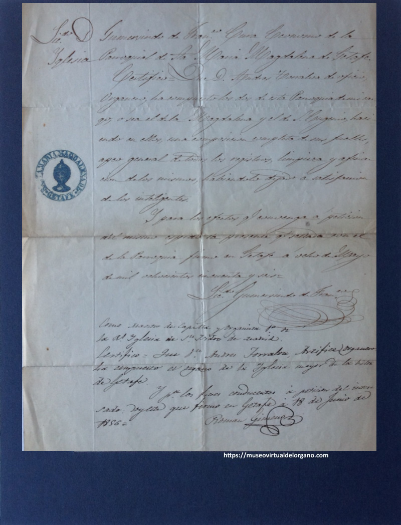 | Notas | “Licenciado D. Gumersindo de Franco, cura economo de la Iglesia Parroquial de Sta María Magdalena de Getafe. Certifico que D. Andrés Torralba de oficio organero ha compuesto los dos de esta Parroquia de mi cargo, osea el de la Magdalena y el de S. Eugenio, haciendo en ellos una composición completa de sus fuelles, apeo general de todos los registros, limpieza y afinación de los mismos, habiendolos dejado a satisfacción de los inteligentes. Y para los efectos a que convenga a petición del mismo expido la presente que sellada con el de la Parroquia firmo en Getafe a ocho de mayo del mil ochocientos cicuenta y seis. Firmado Licenciado D. Gumersindo de Franco Como maestro de capilla y organista 1º de la Sta. Iglesia de San Isidro de Madrid, certifico que D. Andrés Torralba, articife organero ha compuesto el órgano de la Iglesia mayor de la villa de Getafe. Y para los fines conducentes a petición del interesado: doy cita que firmo en Getafe a 18 de junio de 1856. Firmado Román Gimeno” |